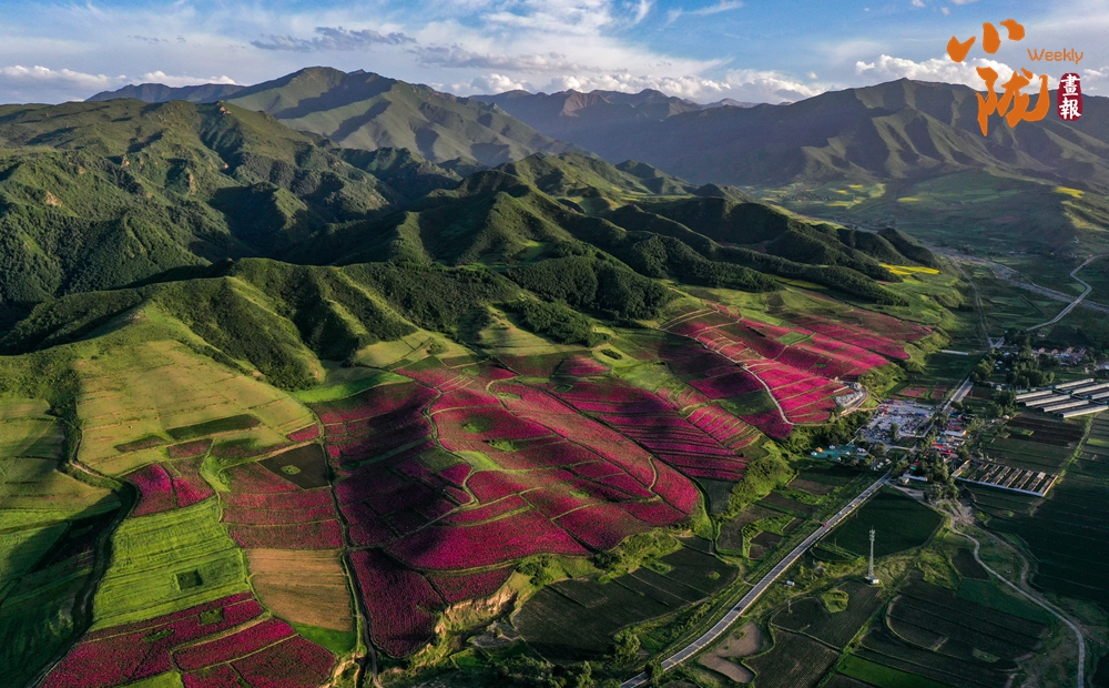 盛夏,這里高聳云天,滿山翠綠,藍(lán)天白云下,如波浪般的山坡上,金色點綴山谷,鮮黃映襯碧綠,玫紅耀眼奪目,將祁連山腳妝點的五彩斑斕。