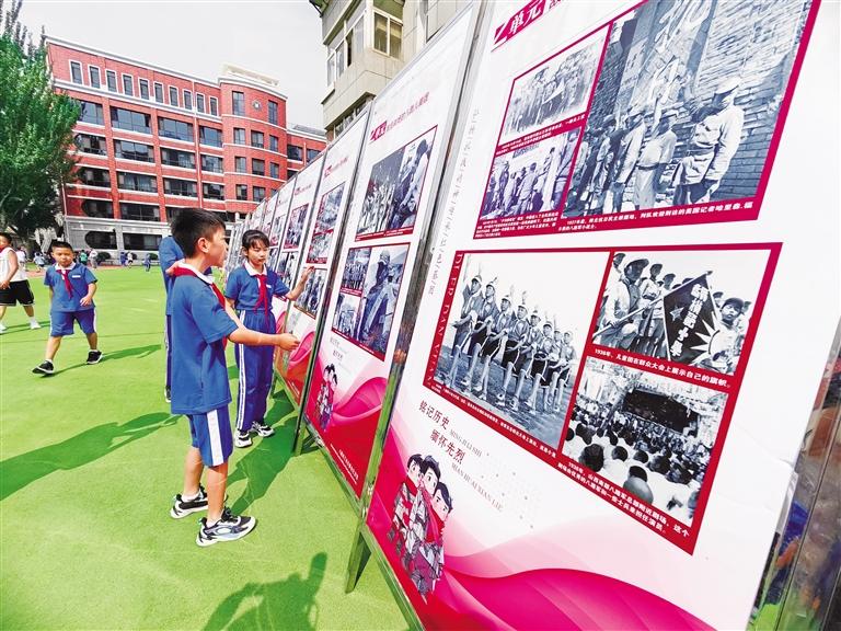 活動(dòng)現(xiàn)場(chǎng),該館講解員給孩子們講述了《抗戰(zhàn)烽火中的少年兒童》及《英雄血灑黃河畔——叢德滋》紅色故事。之后,蘭州市口琴藝術(shù)交流學(xué)會(huì)的成員現(xiàn)場(chǎng)演奏了《沒有共產(chǎn)黨就沒有新中國(guó)》《游擊隊(duì)之歌》《中國(guó)少年先鋒隊(duì)隊(duì)歌》等經(jīng)典紅色曲目。圖為學(xué)生觀看展板。