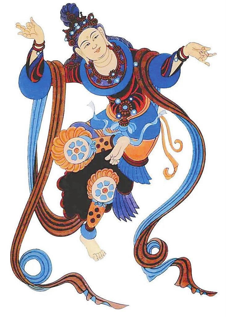 敦煌莫高窟,窟窟有壁畫,拼接起來(lái)長(zhǎng)達(dá)45000多平方米,有世界上“最大畫廊”之稱。這些壁畫中,幾乎每幅都有舞蹈形象,如在窟頂、龕楣、藻井遨游的飛天,憑欄上的天宮伎樂(lè),經(jīng)變畫中的娛佛、敬佛的獻(xiàn)舞者——伎樂(lè)天,出行圖中跳著具有濃郁生活氣息的世俗樂(lè)舞,以及富有舞蹈美感的彩塑菩薩、天王力士等,琳瑯滿目,精妙絕倫。這些舞蹈形象充分反映了從十六國(guó)北朝至元代千余年來(lái)不同歷史時(shí)期的舞蹈服飾、形態(tài)、風(fēng)貌,為我們挖掘、整理、弘揚(yáng)中華民族舞蹈文化提供了十分珍貴的形象資料。