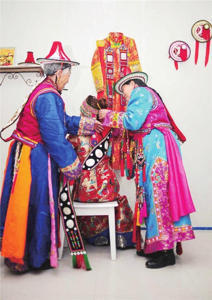 悠揚(yáng)的歌聲中,即將出嫁的女孩,在兩位少婦的精心裝扮下,改變了發(fā)式,戴上喇叭形氈帽,佩戴上胸飾和背飾,戴上用銀牌、玉石、珊瑚、瑪瑙、海貝等編制成的頭面。