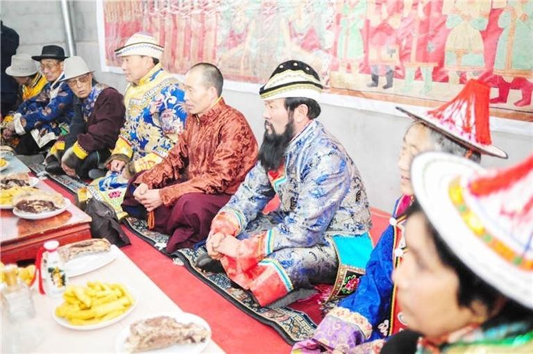 送親隊(duì)伍來到時(shí),迎親的人們向女方客人贈(zèng)送哈達(dá),表示敬意。然后,送親的人下馬飲酒吃飯,謂之“打尖”。