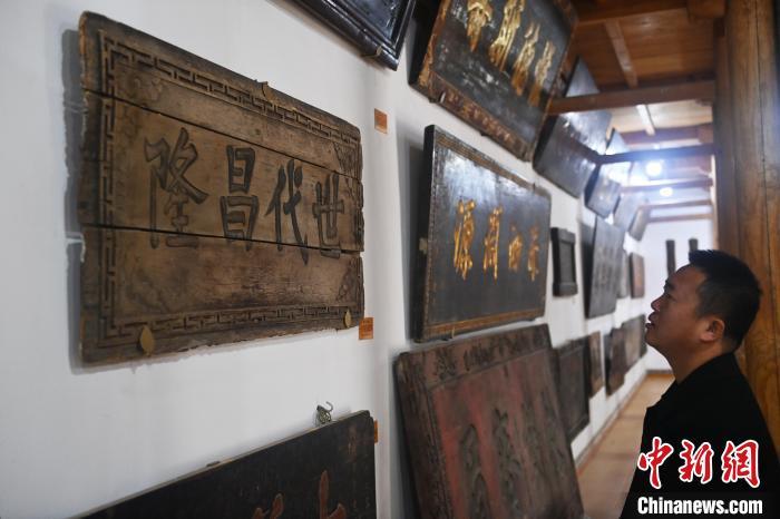 10月23日,甘肅省天水市秦安縣明清街秦安匾額博物館,游人參觀當(dāng)?shù)厥詹氐呢翌~。中新社記者 李亞龍 攝