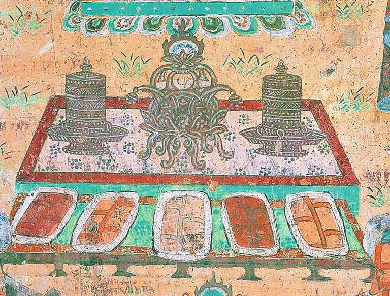 宋朝詩人陸游在《食粥》一詩中寫道:“世人個個學長年,不悟長年在目前。我得宛丘平易法,只將食粥致神仙。”意思是說人人都期盼長壽,怎么也沒有想到,我就成了長壽之人。如果讓我總結一下我長壽的秘訣,那就是我喝的粥多而已。想想冬天到了,天寒地凍,喝碗粥,渾身上下暖烘烘的多美啊。可是在敦煌壁畫里,人們在冬季不是喝粥,而是喝熱牛奶。在莫高窟第146窟壁畫中有一幅“擠牛奶圖”:畫面上一頭健碩的母牛正在被人擠奶,它回首望向擠奶者。在它的身下,還有一只小牛犢正貪婪地望著擠奶者。兩頭牛都憨態(tài)可掬、萌蠢可愛。漫天飛雪中,煮沸的牛奶溫暖著漫長冬季的每時每刻。在莫高窟第302窟中有一幅“湯水浴圖”。湯水就是溫泉。畫面上在樹木掩映之下有一池溫泉,有一大一小兩個人正沉浸在溫泉沐浴的歡快之中??梢?,伴著紛飛的大雪泡個溫泉,不是只有今天才有的享受;在千年之前的敦煌,人們就已經開始修建溫室浴池,而且引水排水的技術已經較為完善。院落依依、親朋融融、池水湯湯、筋骨軟軟,逸興悠悠。