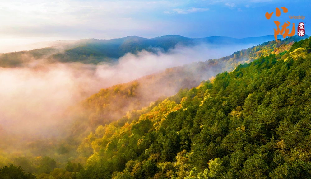 雨后日出,云遮霧蓋,為子午嶺披上一襲薄紗。金黃、深綠在陽光下熠熠生輝,彰顯著生命的活力,形成了一片生機(jī)勃勃的天地。
