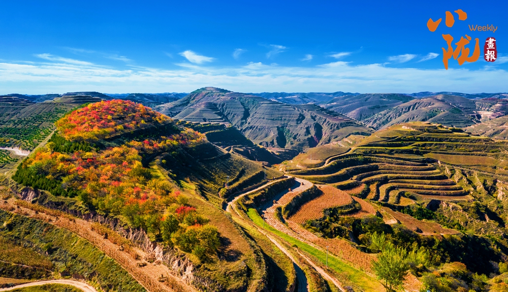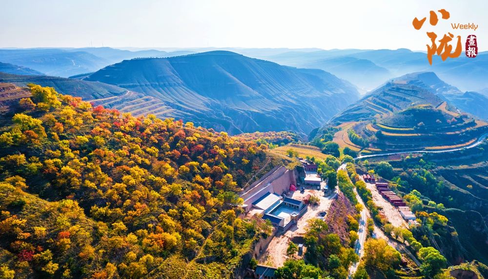 放眼望去,層林盡染,秋色與藍(lán)天白云相互映襯,把這里的溝壑梁峁裝點的五彩斑斕。