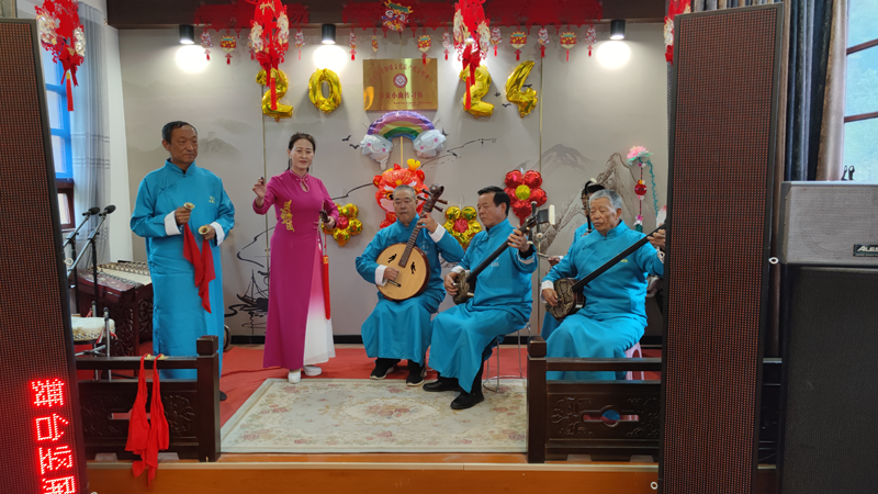 秦安縣集賢村文化活動室內(nèi),集賢文藝劇社的社員們正在排練演唱新編秦安小曲。新華網(wǎng)發(fā)(郭林玉 攝)