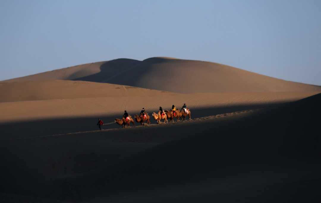 12月23日,游客在甘肅省敦煌市鳴沙山月牙泉景區(qū)游覽。