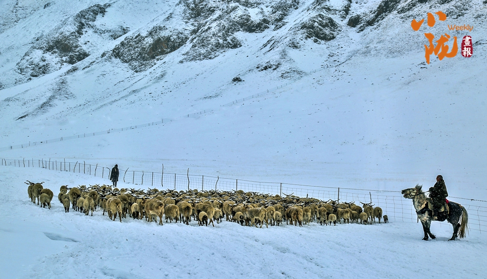 天地一色,萬物寂靜,風(fēng)雪牧歸。牧民在雪地里放牧牛羊,人和羊在白雪覆蓋的草原上共同演繹著生活的樂章。