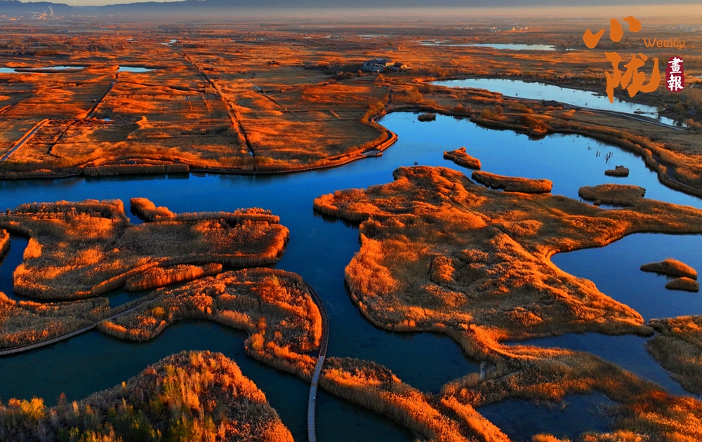 濕地天晴,碧水環(huán)繞,萬(wàn)畝葦蕩一片金黃,仿佛是一幅富有層次感的油畫,令人陶醉。