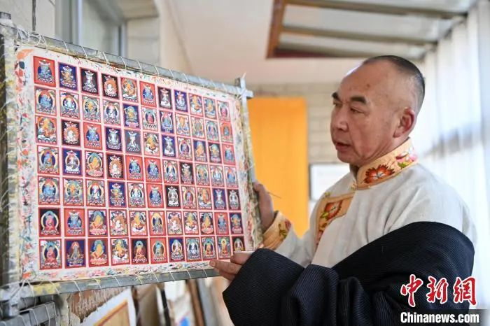 2024年2月2日,甘肅夏河,甘南藏族唐卡國(guó)家級(jí)代表性傳承人交巴加布在家中展示其繪制的唐卡。(資料圖)九美旦增 攝