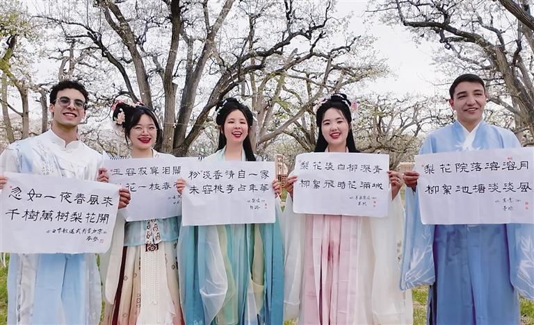 在接下來的詩詞互動(dòng)環(huán)節(jié),外籍留學(xué)生開啟換裝模式,身著漢服,徜徉在梨花樹下,吟誦著“梨花”主題的詩句,感受中國漢服之美和中國傳統(tǒng)文化的魅力。換裝后的外籍留學(xué)生也讓梨園秒變“出片現(xiàn)場(chǎng)”。“這是我第一次穿漢服,穿著漢服在梨園里拍的照片真的很好看。”來自越南的黃青草,迫不及待地想把這份梨園的浪漫春日記憶分享給自己的同學(xué)、朋友。