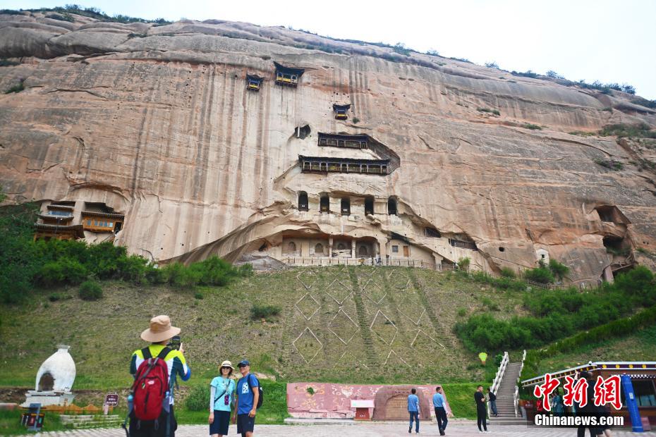 6月23日,位于甘肅省張掖市肅南裕固族自治縣祁連山下的馬蹄寺石窟前,游人拍照。馬蹄寺石窟因傳說中的天馬在此飲水落有馬蹄印而得名,馬蹄寺石窟群開鑿于十六國北涼時期,距今1600多年的歷史,與敦煌莫高窟、瓜州榆林窟并稱為河西佛教圣地三大藝術寶窟,是中國唯一一處棧道修筑于崖體之內的石窟。馬蹄寺石窟群由千佛洞、馬蹄南寺、馬蹄北寺等多個單元組成,窟內保存著從北涼到明代的珍貴塑像500余身,壁畫1200多平方米。中新社記者 李亞龍 攝