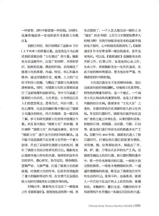 回到蘭州后,我仔細(xì)拜讀了這部85萬(wàn)字(上下兩冊(cè))的厚重論著。這是我迄今為止閱讀到的首部縣級(jí)“文化概論”的專著。佩彰先生在這部書中,以寬廣的視野,豐厚的學(xué)識(shí),獨(dú)到的見(jiàn)地,縝密的歸納,系統(tǒng)闡述了鎮(zhèn)原文化的淵源、內(nèi)涵、特征、核心和基本精神,通過(guò)對(duì)鎮(zhèn)原歷史、地理、人文的廣泛探尋和深入挖掘,勾勒出了鎮(zhèn)原文化演變的清晰脈絡(luò)。同時(shí),對(duì)鎮(zhèn)原文化的主要載體進(jìn)行了全新梳理和創(chuàng)新研究。書中不僅涵蓋了鎮(zhèn)原的文化狀況、文化形態(tài)、文化特征以及人們的思想觀念、思維方式、風(fēng)俗習(xí)慣、文化心理等,而且在探幽析微中揭示出了鎮(zhèn)原文化蘊(yùn)含的特色、樣式和規(guī)律,是一部系統(tǒng)了解、學(xué)習(xí)和研究鎮(zhèn)原文化的學(xué)術(shù)性理論專著。并且首次提出“鎮(zhèn)原文化”的命題,首次闡釋“鎮(zhèn)原文化”的內(nèi)涵及演變,首次對(duì)“鎮(zhèn)原文化”進(jìn)行全方位的歸納和解讀。這不能不說(shuō)是鎮(zhèn)原乃至甘肅文化界的一個(gè)重大創(chuàng)舉,開啟了系統(tǒng)研究鎮(zhèn)原文化的先河,填補(bǔ)了鎮(zhèn)原文化綜合性研究的空白。佩彰先生以鎮(zhèn)原本地人特有的執(zhí)著、雄厚的積淀和務(wù)實(shí)的學(xué)風(fēng),潛心研究,恰當(dāng)定位,精準(zhǔn)概括,邏輯嚴(yán)密,文辭嚴(yán)謹(jǐn),打造了鎮(zhèn)原文化的新高地,對(duì)鎮(zhèn)原文化的傳承、弘揚(yáng)和發(fā)展起到了重大的輻射帶動(dòng)作用,在甘肅乃至全國(guó)縣級(jí)文化研究領(lǐng)域具有示范性和導(dǎo)向性。