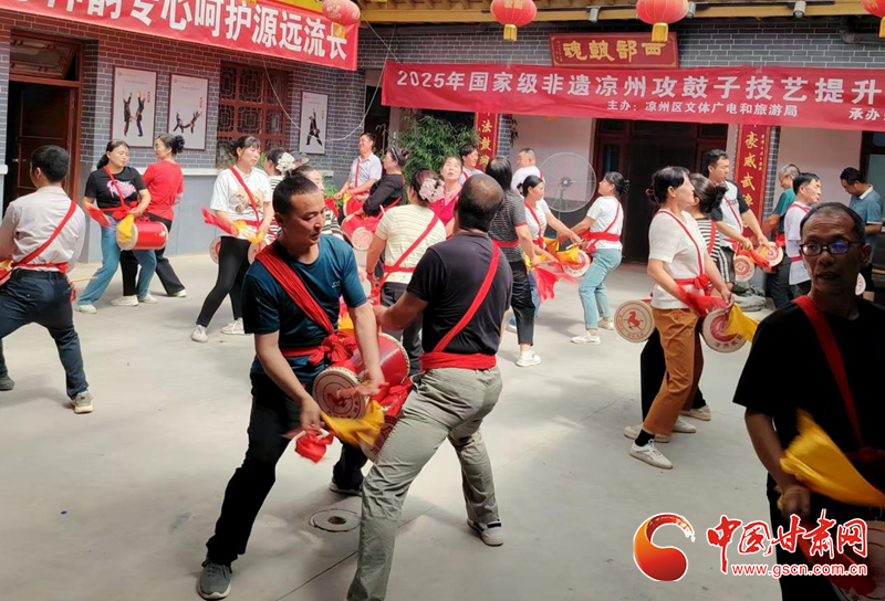 中國甘肅網(wǎng)7月19日訊(西北角·中國甘肅網(wǎng)記者 張振國 文/圖)為扎實(shí)推進(jìn)國家級(jí)非物質(zhì)文化遺產(chǎn)項(xiàng)目傳承與保護(hù),系統(tǒng)提升涼州攻鼓子團(tuán)隊(duì)專業(yè)水平,發(fā)展壯大攻鼓子傳承人隊(duì)伍。7月16日,由涼州區(qū)文體廣電和旅游局主辦、涼州區(qū)文化館承辦的2025年涼州攻鼓子傳承人技藝提升培訓(xùn)班分別在“涼州攻鼓子傳習(xí)所”和“四壩鎮(zhèn)非遺民俗文化館”開班。