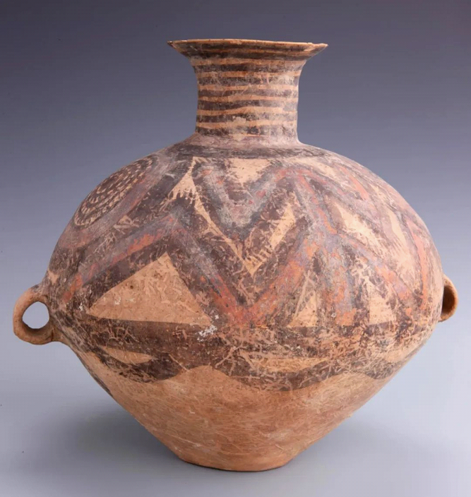 彩陶蛙紋壺,新石器時(shí)代馬家窯文化馬廠類型,高42厘米,口徑13.1厘米。壺泥質(zhì)紅陶,口外侈,薄唇,球形腹,小平底,腹部?jī)蓚?cè)對(duì)稱置雙系。于橙紅色陶衣上以黑彩描繪變形蛙紋。圖案線條流暢,富于變化,與造型協(xié)調(diào)一致。據(jù)科學(xué)測(cè)試,馬家窯文化馬廠類型彩陶的年代約為公元前2200~前2000年。變形蛙紋作為馬家窯文化馬廠類型彩陶上常見的裝飾紋樣之一,體現(xiàn)了遠(yuǎn)古人們對(duì)于繁衍生殖的渴望。青蛙產(chǎn)下許多卵,孵出許多蝌蚪,正是繁衍旺盛的象征。
