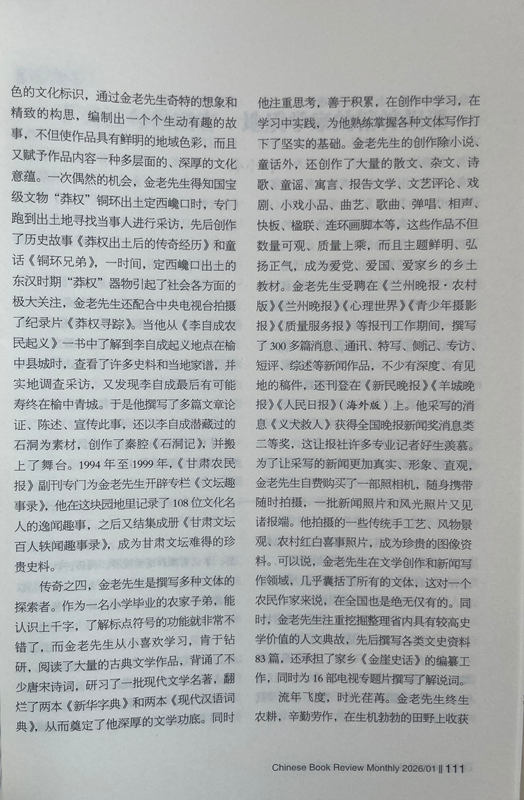 傳奇之四,金老先生是撰寫多種文體的探索者。作為一名小學(xué)畢業(yè)的農(nóng)家子弟,能認(rèn)識上千字,了解標(biāo)點符號的功能就非常不錯了,而金老先生從小喜歡學(xué)習(xí),肯于鉆研,閱讀了大量的古典文學(xué)作品,背誦了不少唐宋詩詞,研習(xí)了一批現(xiàn)代文學(xué)名著,翻爛了兩本《新華字典》和兩本《現(xiàn)代漢語詞典》,從而奠定了他深厚的文學(xué)功底。同時他注重思考,善于積累,在創(chuàng)作中學(xué)習(xí),在學(xué)習(xí)中實踐,為他熟練掌握各種文體寫作打下了堅實的基礎(chǔ)。金老先生的創(chuàng)作除小說、童話外,還創(chuàng)作了大量的散文、雜文、詩歌、童謠、寓言、報告文學(xué)、文藝評論、戲劇、小戲小品、曲藝、歌曲、彈唱、相聲、快板、楹聯(lián)、連環(huán)畫腳本等,這些作品不但數(shù)量可觀、質(zhì)量上乘,而且主題鮮明、弘揚正氣,成為愛黨、愛國、愛家鄉(xiāng)的鄉(xiāng)土教材。金老先生受聘在《蘭州晚報·農(nóng)村版》《蘭州晚報》《心理世界》《青少年攝影報》《質(zhì)量服務(wù)報》等報刊工作期間,撰寫了300多篇消息、通訊、特寫、側(cè)記、專訪、短評、綜述等新聞作品,不少有深度、有見地的稿件,還刊登在《新民晚報》《羊城晚報》《人民日報》(海外版)上。他采寫的消息《義犬救人》獲得全國晚報新聞獎消息類二等獎,這讓報社許多專業(yè)記者好生羨慕。為了讓采寫的新聞更加真實、形象、直觀,金老先生自費購買了一部照相機,隨身攜帶隨時拍攝,一批新聞?wù)掌惋L(fēng)光照片又見諸報端。他拍攝的一些傳統(tǒng)手工藝、風(fēng)物景觀、農(nóng)村紅白喜事照片,成為珍貴的圖像資料??梢哉f,金老先生在文學(xué)創(chuàng)作和新聞寫作領(lǐng)域,幾乎囊括了所有的文體,這對一個農(nóng)民作家來說,在全國也是絕無僅有的。同時,金老先生注重挖掘整理省內(nèi)具有較高史學(xué)價值的人文典故,先后撰寫各類文史資料83篇,還承擔(dān)了家鄉(xiāng)《金崖史話》的編纂工作,同時為16部電視專題片撰寫了解說詞。