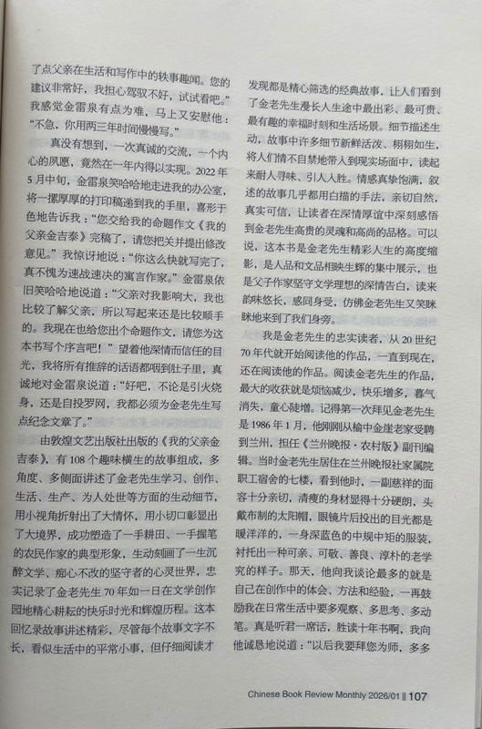 由敦煌文藝出版社出版的《我的父親金吉泰》,有108個趣味橫生的故事組成,多角度、多側(cè)面講述了金老先生學(xué)習(xí)、創(chuàng)作、生活、生產(chǎn)、為人處世等方面的生動細(xì)節(jié),用小視角折射出了大情懷,用小切口彰顯出了大境界,成功塑造了一手耕田、一手握筆的農(nóng)民作家的典型形象,生動刻畫了一生沉醉文學(xué)、癡心不改的堅守者的心靈世界,忠實記錄了金老先生70年如一日在文學(xué)創(chuàng)作園地精心耕耘的快樂時光和輝煌歷程。這本回憶錄故事講述精彩,盡管每個故事文字不長,看似生活中的平常小事,但仔細(xì)閱讀才發(fā)現(xiàn)都是精心篩選的經(jīng)典故事,讓人們看到了金老先生漫長人生途中最出彩、最可貴、最有趣的幸福時刻和生活場景。細(xì)節(jié)描述生動,故事中許多細(xì)節(jié)新鮮活潑、栩栩如生,將人們情不自禁地帶入到現(xiàn)實場面中,讀起來耐人尋味、引人入勝。情感真摯飽滿,敘述的故事幾乎都用白描的手法,親切自然,真實可信,讓讀者在深情厚誼中深刻感悟到金老先生高貴的靈魂和高尚的品格。可以說,這本書是金老先生精彩人生的高度縮影,是人品和文品相映生輝的集中展示,也是父子作家堅守文學(xué)理想的深情告白,讀來韻味悠長,感同身受,仿佛金老先生又笑瞇瞇地來到了我們身旁。