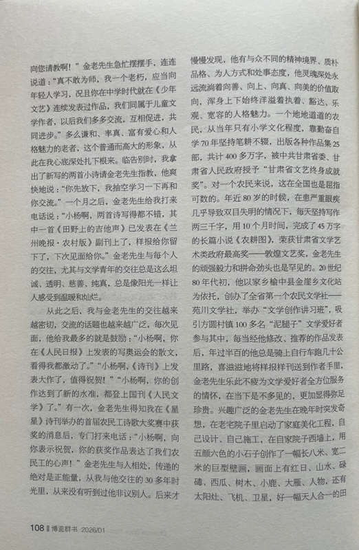 從此之后,我與金老先生的交往越來越密切,交流的話題也越來越廣泛,每次見面,他給我最多的就是鼓勵:“小楊啊,你在《人民日報》上發(fā)表的寫奧運會的散文,看得我都激動了。”“小楊啊,《詩刊》上發(fā)表大作了,值得祝賀!”“小楊啊,你的創(chuàng)作達(dá)到了新的水準(zhǔn),都登上國刊《人民文學(xué)》了。”有一次,金老先生得知我在《星星》詩刊舉辦的首屆農(nóng)民工詩歌大獎賽中獲獎的消息后,專門打來電話:“小楊啊,向你表示祝賀,你的獲獎作品表達(dá)了我們農(nóng)民工的心聲!”金老先生與人相處,傳遞的絕對是正能量,從我與他交往的30多年時光里,從來沒有聽到過他非議別人。后來才慢慢發(fā)現(xiàn),他有與眾不同的精神境界、質(zhì)樸品格、為人方式和處事態(tài)度,他靈魂深處永遠(yuǎn)流淌著向善、向上、向真、向美的價值取向,渾身上下始終洋溢著執(zhí)著、豁達(dá)、樂觀、寬容的人格魅力。一個地地道道的農(nóng)民,從當(dāng)年只有小學(xué)文化程度,靠勤奮自學(xué)70年堅持筆耕不輟,出版各種作品集25部,共計400多萬字,被中共甘肅省委、甘肅省人民政府授予“甘肅省文藝終身成就獎”。對一個農(nóng)民來說,這在全國也是屈指可數(shù)的。年近80歲的時候,在患嚴(yán)重眼疾幾乎導(dǎo)致雙目失明的情況下,每天堅持寫作兩三千字,用10個月時間,完成了45萬字的長篇小說《農(nóng)耕圖》,榮獲甘肅省文學(xué)藝術(shù)類政府最高獎——敦煌文藝獎,金老先生的頑強毅力和拼命勁頭也是罕見的。20世紀(jì)80年代初,他以家鄉(xiāng)榆中縣金崖鄉(xiāng)文化站為依托,創(chuàng)辦了全省第一個農(nóng)民文學(xué)社——苑川文學(xué)社,舉辦“文學(xué)創(chuàng)作講習(xí)班”,吸引方圓村鎮(zhèn)100多名“泥腿子”文學(xué)愛好者參與其中,每當(dāng)經(jīng)他修改、推薦的作品發(fā)表后,年過半百的他總是騎上自行車跑幾十公里路,喜滋滋地將樣報樣刊送到作者手里,金老先生樂此不疲為文學(xué)愛好者全方位服務(wù)的情懷,在當(dāng)下是不多見的,更加顯得彌足珍貴。興趣廣泛的金老先生在晚年時突發(fā)奇想,在老宅院子里啟動了家庭美化工程,自己設(shè)計、自己施工,在自家院子西墻上,用五顏六色的小石子創(chuàng)作了一幅長八米、寬二米的巨型壁畫,畫面上有紅日、山水、碌碡、西瓜、樹木、小鹿、大雁、人物,還有太陽灶、飛機、衛(wèi)星,好一幅天人合一的田園風(fēng)光畫。站在壁畫面前,讓人遐想萬千、拍手叫絕,這一獨具特色的創(chuàng)舉,完全表達(dá)了金老先生所渴望的理想王國和精神家園。2014年4月,金老先生家庭被國家廣播電視總局授予首屆全國“書香之家”稱號。進入耄耋之年的金老先生,創(chuàng)作激情依然旺盛,他又癡迷于劇本創(chuàng)作,先后創(chuàng)編了大型劇目4部,小戲小品曲藝46個。他不僅要創(chuàng)作劇本,而且還要想方設(shè)法搬上舞臺。為此他東奔西跑,甚至還要自掏腰包,千方百計尋找業(yè)余劇團,想盡辦法爭取高水平、低成本演出。雁過留聲,腳踏留痕,鄉(xiāng)村廣場、學(xué)校操場、打麥場上都留下了他帶隊演出的閃光足跡和百姓的歡歌笑語。興致高時,金老先生還上臺扮演一個角色,過足他愛戲唱戲的癮,完全和大家心連心、共歡樂。晚年的他最喜歡表演自編自導(dǎo)的古劇種“扁擔(dān)戲”,除了在村上幼兒園演出外,大多在自家的院子里演出,有時觀眾只有他老伴和孫女,還有一條忠實的小狗。金老先生用這種獨特的方式,表達(dá)對民族優(yōu)秀傳統(tǒng)文化的敬畏和弘揚,也讓我們感受到一位真正熱愛生活的作家,一定是牢牢生根在生他養(yǎng)他的這片土地上。2018年2月,他破例給子女們提出了一個心愿,在3月25日他85歲生日時,舉辦一場小型的家庭音樂會。于是金老先生請來了業(yè)余樂隊和歌唱演員,用合唱、歌伴舞等形式演出了由金老先生作詞的歌曲。金老先生身著紅色的盛裝,親自登臺演唱了由他改編的民歌《繡荷包》。他為家庭音樂會演出臺上撰寫的對聯(lián)是:音樂陶冶性情管弦悠揚動四方,歌曲傳遞精神國歌隆重傳海外。兩個月后,金老先生安然去世,這場家庭音樂會竟成為他生命中的絕唱。金老先生就是這樣一位具有獨特人生信念、抱有獨特處世態(tài)度、富有獨特生活情趣、擁有獨特明亮童心的農(nóng)民作家,他身上始終散發(fā)著許多奇思妙想、創(chuàng)新火花和智慧光亮,讓人充滿無窮的敬意、敬畏和敬佩,我甚至認(rèn)為金老先生就是一位傳奇之人。