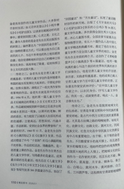 傳奇之二,金老先生是甘肅兒童文學(xué)的奠基者。甘肅的兒童文學(xué)創(chuàng)作是伴隨著共和國的誕生而發(fā)展壯大起來的,盡管起步較晚,但勢頭強勁,涌現(xiàn)出了一批優(yōu)秀作家和有影響的作品,金老先生就是其中的佼佼者。1956年6月,他的第一篇兒童文學(xué)作品《長城南邊的草地上》在《甘肅文藝》發(fā)表,作品敏銳捕捉到新中國成立后逐步出現(xiàn)的城鄉(xiāng)差別這一現(xiàn)象,以犀利的筆觸、鮮活的語言,有力批駁了以城里人自居而形成的優(yōu)越感,立意高遠(yuǎn),思想深刻,內(nèi)涵豐富,手法新穎,受到社會各界的贊譽和廣大讀者的好評。1960年11月,金老先生創(chuàng)作的《小滿歷險記》在《紅旗手》發(fā)表,作品成功塑造了外號“千里駒”的馬小滿聰明能干的形象,作品輕松活潑,情趣盎然,是一部質(zhì)量上乘的作品。金老先生作為甘肅杰出的兒童文學(xué)作家,寫得最多的是童話,成果最豐碩的也是童話。他先后在《兒童文學(xué)》《東方少年》《少年文藝》《幼兒文學(xué)》《童話報》等報刊發(fā)表300多篇童話作品,獨創(chuàng)了“田園童話”和“天生童話”,拓寬了童話題材創(chuàng)作的新天地,出版了《月牙泉的天馬》《小毛驢出國》《快樂的小公雞》等16部兒童文學(xué)作品集,多次獲得全國優(yōu)秀少兒圖書獎、冰心兒童圖書獎、全國農(nóng)家書屋重點出版物推薦目錄,有五六十篇作品入選中國兒童文學(xué)精選和典藏書庫,奠定了他在甘肅兒童文學(xué)界乃至全國兒童文學(xué)界的地位。金老先生在去世前的兩個月,還創(chuàng)作了《青蛙借雷聲》《小鎮(zhèn)典故》等6篇童話,他用一顆純真的童心與這個美好的世界和天真的孩子們深情告白。他是甘肅兒童文學(xué)的開創(chuàng)者、親歷者、實踐者和奠基者,他的成果已載入甘肅兒童文學(xué)乃至中國兒童文學(xué)的史冊,正如著名作家安武林評價:“在中國兒童文學(xué)作家之中,以農(nóng)民身份,抒寫兒童文學(xué)作品,終其一生,成就斐然者,唯此一人,金吉泰先生也。”