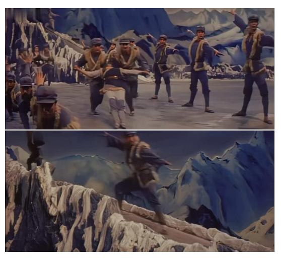 《紅軍不怕遠(yuǎn)征難》作為《中國革命之歌》中長征主題片段,突破了單一形式局限,融合演唱、交響樂、舞蹈、布景、光影、朗誦與歷史影像,打造出立體視聽效果。作品在宏大敘事中加入戰(zhàn)士互助、風(fēng)雪行軍等細(xì)膩細(xì)節(jié),強化人物情感與精神刻畫,打破傳統(tǒng)敘事框架,為平衡歷史真實與藝術(shù)審美提供了獨特范本。