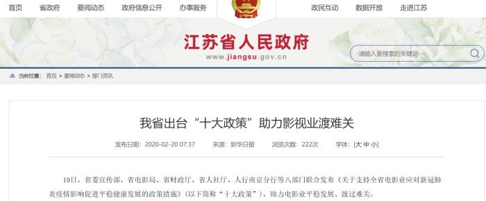 2月19日,江蘇省八部門聯(lián)合發(fā)布《關(guān)于支持全省電影業(yè)應(yīng)對新冠肺炎疫情影響促進平穩(wěn)健康發(fā)展的政策措施》,即“影十條”,從落實稅收優(yōu)惠政策、加強財政支持力度、加大信貸投放、減免房租等十方面幫助電影業(yè)。