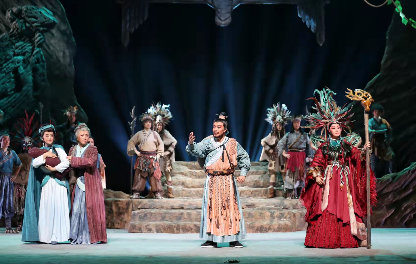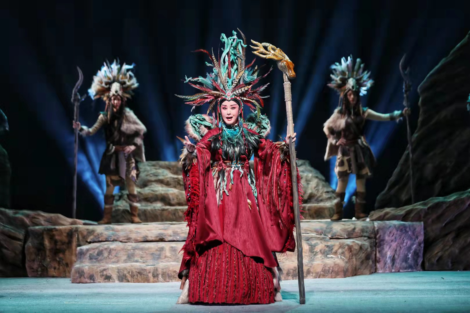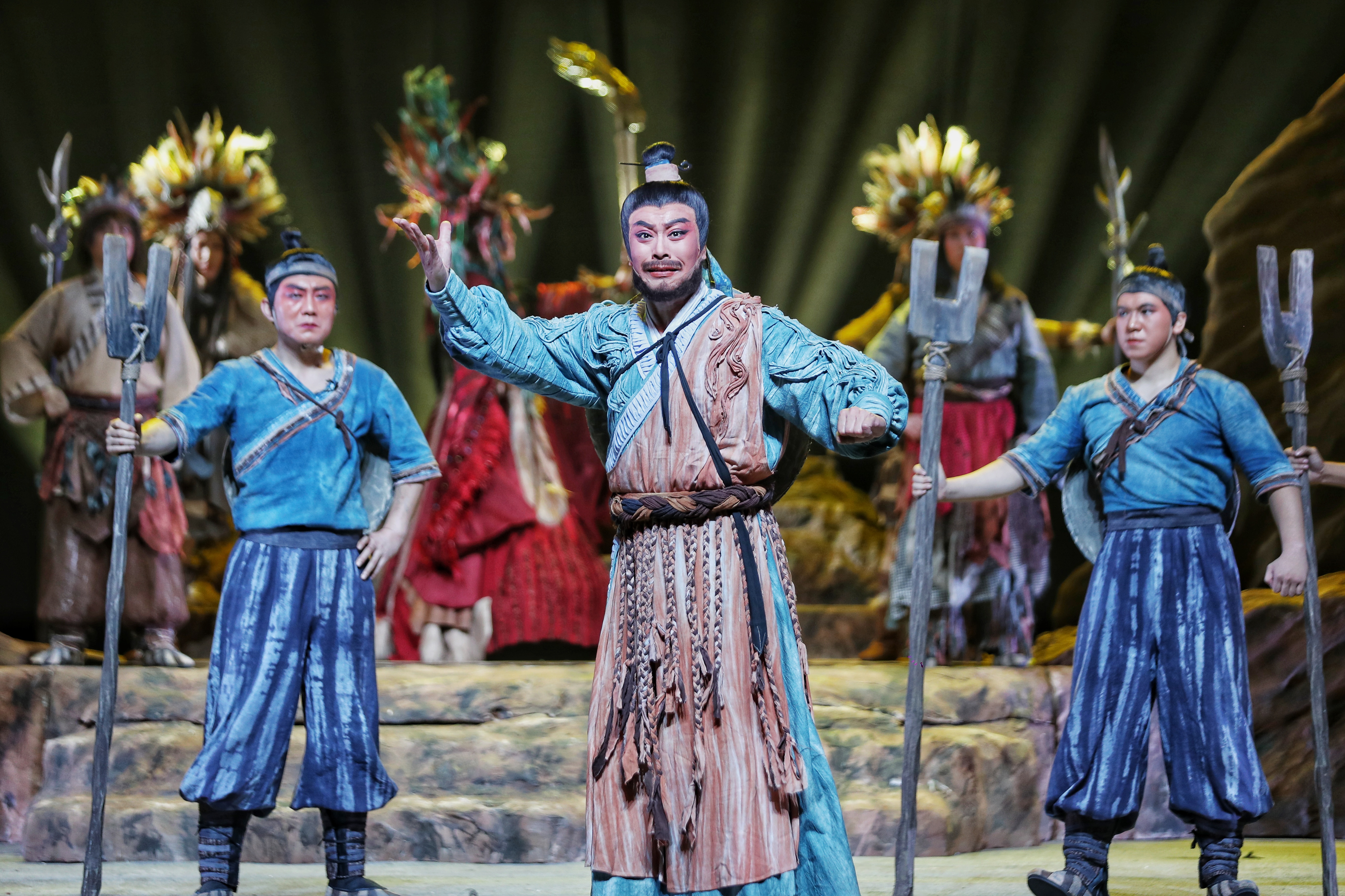 在兩個(gè)多小時(shí)的演出中,扮演“大禹”的邵炳德唱念做打俱佳,將一個(gè)人性化、頂天立地的大禹形象立于舞臺(tái)之上,三朵隴劇“梅花”雷通霞、佟紅梅、竇鳳霞,分別在劇中扮演山戎、大禹妻子涂嬌和禹母的角色,全體演員以精湛的表演,將大禹治水過(guò)程中天理與人性、親情與仇恨、生與死的抉擇演繹得淋漓盡致。