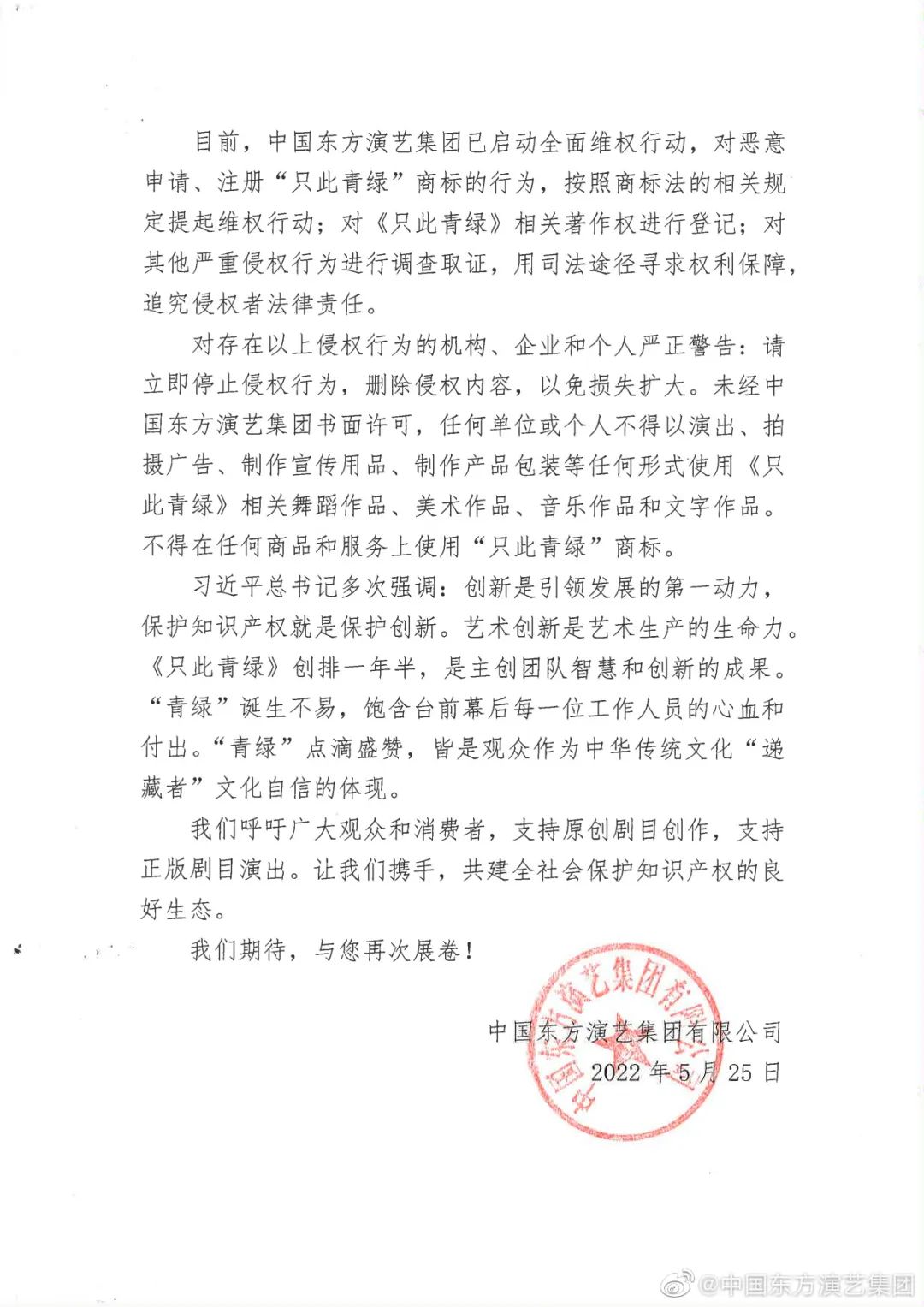 聲明指出,對(duì)惡意申請(qǐng)、注冊(cè)“只此青綠”商標(biāo)的行為,按照商標(biāo)法的相關(guān)規(guī)定提起維權(quán)行動(dòng);對(duì)《只此青綠》相關(guān)著作權(quán)進(jìn)行登記;對(duì)其他嚴(yán)重侵權(quán)行為進(jìn)行調(diào)查取證,用司法途徑尋求權(quán)利保障,追究侵權(quán)者法律責(zé)任。