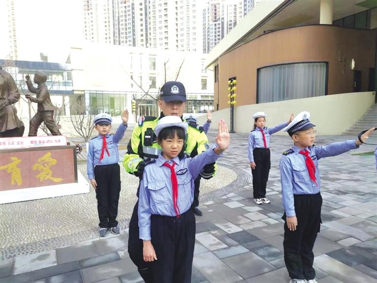 活動中,交警針對學生年齡特點和認知特征,一邊一招一式地演示,一邊講解每一個指揮手勢的要領和含義,讓同學們在邊學邊練的感性實踐中,加深對交通安全常識的理解與記憶。