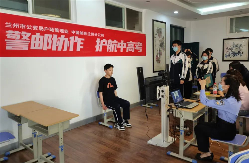 在由蘭州市公安局戶政管理處、七里河分局治安二大隊、小西湖派出所、酒泉路派出所的民警與郵政公司工作人員在學(xué)校共同舉行的業(yè)務(wù)辦理中,民警們分工協(xié)作,1名民警負責(zé)拍照、編號存儲,1名民警和1名郵政公司工作人員負責(zé)錄入辦證考生的指紋信息,1名民警負責(zé)二次核對采集信息,3—5分鐘就能完成一名學(xué)生的身份證全流程采集工作。人像采集時,民警還貼心地準(zhǔn)備了深色男女生外套,鏡子、梳子、皮筋、發(fā)卡、噴霧等美妝工具,確保每一名現(xiàn)場辦證的學(xué)生最終都能拿到滿意的身份證,信心滿滿的奔赴考場。蘭州公安專業(yè)、貼心、細致、高效的服務(wù),得到了廣大師生和家長的一致好評與交口稱贊。