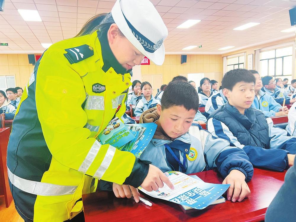 民警向?qū)W生講解交通安全知識。2月26日,臨潭縣公安局交警大隊組織民警走進臨潭縣回民中學(xué),開展交通安全進校園宣傳活動。 新甘肅·甘肅法治報記者金凡裕攝