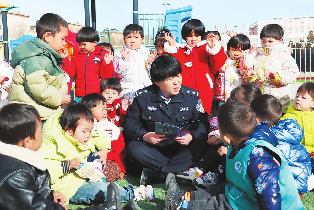 民警向小朋友講解法律知識(shí)。3月3日,隴西縣公安局西郊派出所民輔警走進(jìn)幼兒園,開(kāi)展法治宣傳和安全教育。新甘肅·甘肅法治報(bào)通訊員朱艷霞攝