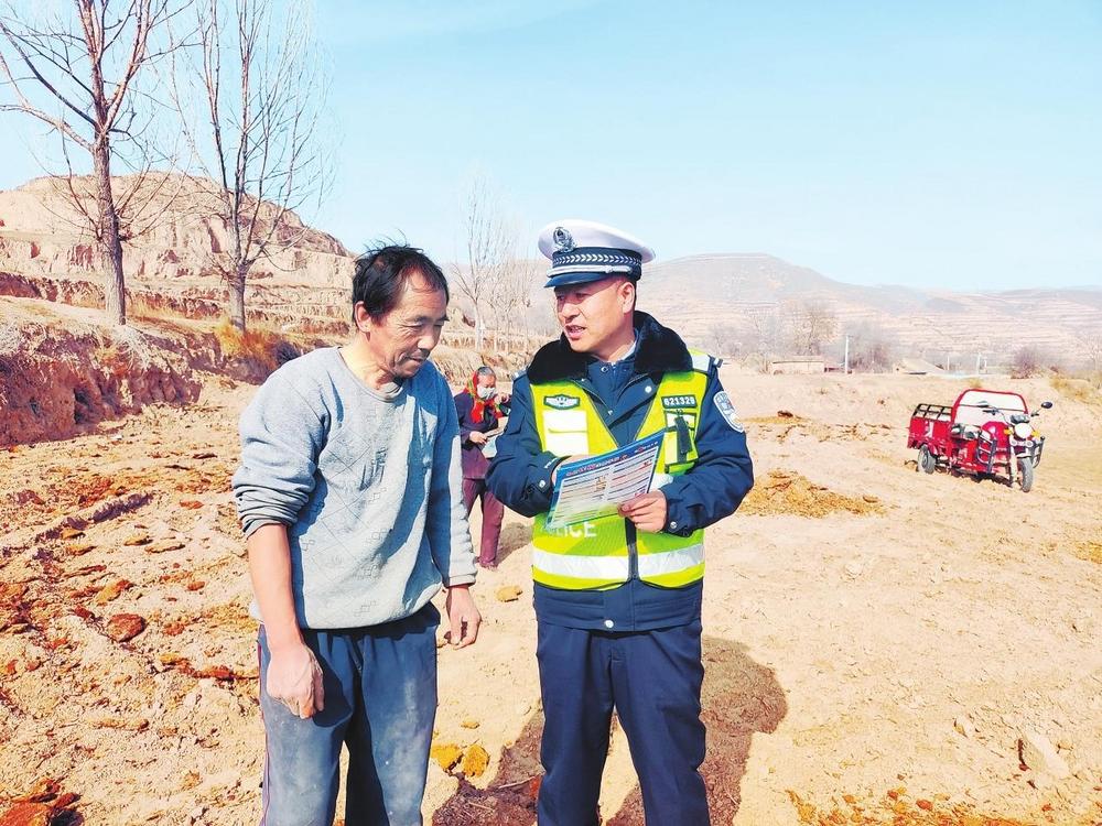 民警向群眾講解法律法規(guī)。3月10日,隴西縣公安局渭陽(yáng)派出所民警深入田間地頭,開(kāi)展道路交通安全和反電詐宣傳?! ⌒赂拭C·甘肅法治報(bào)通訊員劉榮攝