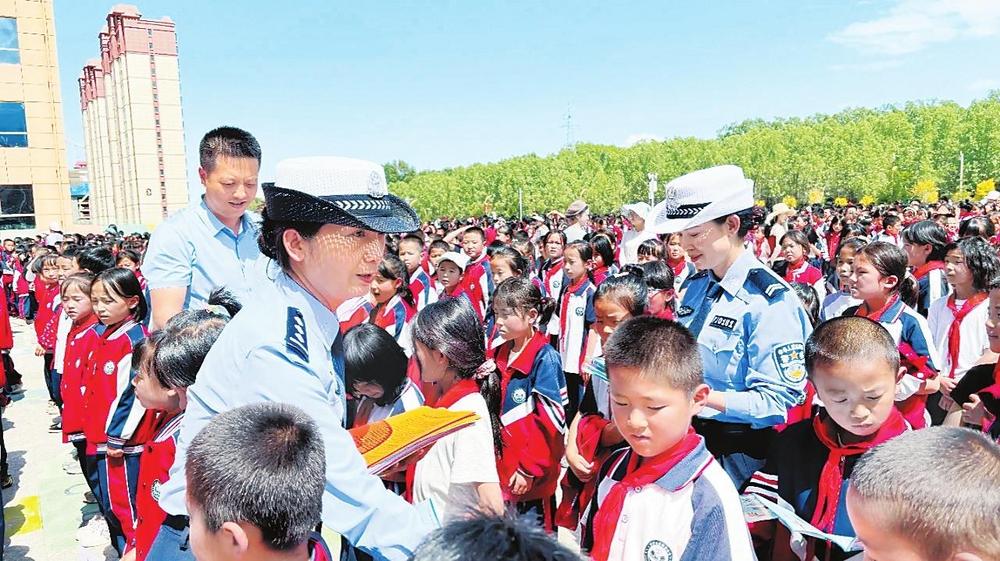 民警向學生發(fā)放宣傳資料。6月26日,積石山縣公安局交警大隊民警走進城西小學,開展“知危險會避險”交通安全宣傳教育活動,給學生們上了一堂暑期交通安全課。 新甘肅·甘肅法治報通訊員趙小紅攝