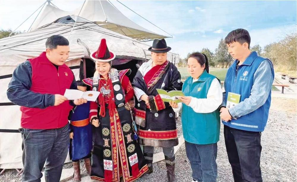 黨城灣鎮(zhèn)綜治中心組織網(wǎng)格員走進(jìn)牧區(qū)開(kāi)展法治宣傳活動(dòng)(2024年8月20日拍攝)。 肅北縣委政法委供圖