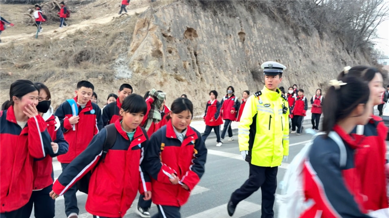 ▲東鄉(xiāng)縣公安局民輔警開展護學(xué)工作,重點在校園周邊開展交通疏導(dǎo)、清理違停車輛、引導(dǎo)學(xué)生安全過馬路。(完瑪草 攝)
