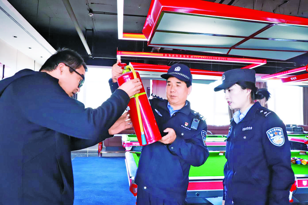 王進(jìn)保(右)在經(jīng)營(yíng)場(chǎng)所檢查消防安全。