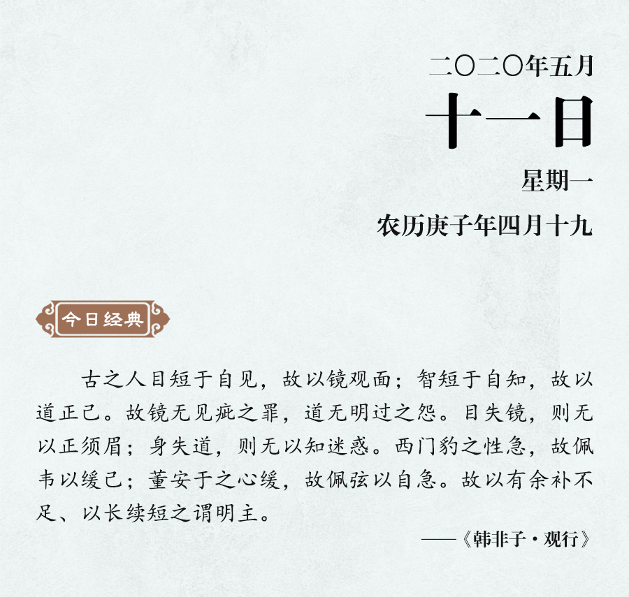 《老子》說(shuō):“知人者智,自知者明。”如果不能很好地認(rèn)識(shí)到自己的長(zhǎng)處和短處,就不能透徹地了解事物。韓非進(jìn)一步說(shuō):“目短于自見(jiàn),故以鏡觀面;智短于自知,故以道正己。”無(wú)論是明君還是賢人,都要明確認(rèn)識(shí)到自身的不足,如此才能自知自見(jiàn)。“目失鏡則無(wú)以正須眉,身失道則無(wú)以知迷惑。”這既是說(shuō)自見(jiàn)的局限,也是說(shuō)自知的重要。韓非舉例說(shuō),魏國(guó)的西門豹因?yàn)樾愿窦痹?,所以佩戴柔軟的皮帶?lái)提醒自己;董安于因?yàn)樾宰雍苈耘宕骺嚲o的弓弦來(lái)激勵(lì)自己,這兩位都是能夠自知不足的人。
