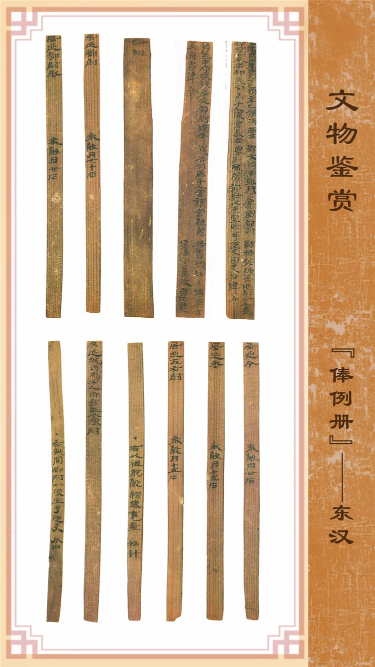 1974年8月出土于甲渠候官遺址第22號(hào)房址內(nèi)。簡(jiǎn)冊(cè)由10枚簡(jiǎn)組成,每簡(jiǎn)長(zhǎng)22.8厘米,前兩簡(jiǎn)寬2.5厘米,其余8簡(jiǎn)寬1.4厘米。全文200字。內(nèi)容為東漢建武三年(公元25年)竇融統(tǒng)治河西期間留下的一份完整的財(cái)政文書。簡(jiǎn)文是關(guān)于居延都尉府吏員奉谷標(biāo)準(zhǔn)的通知,由領(lǐng)河西五郡大將軍張掖屬國都尉竇融幕府下發(fā),簡(jiǎn)言“如律令”可知其指令具有法律效力。