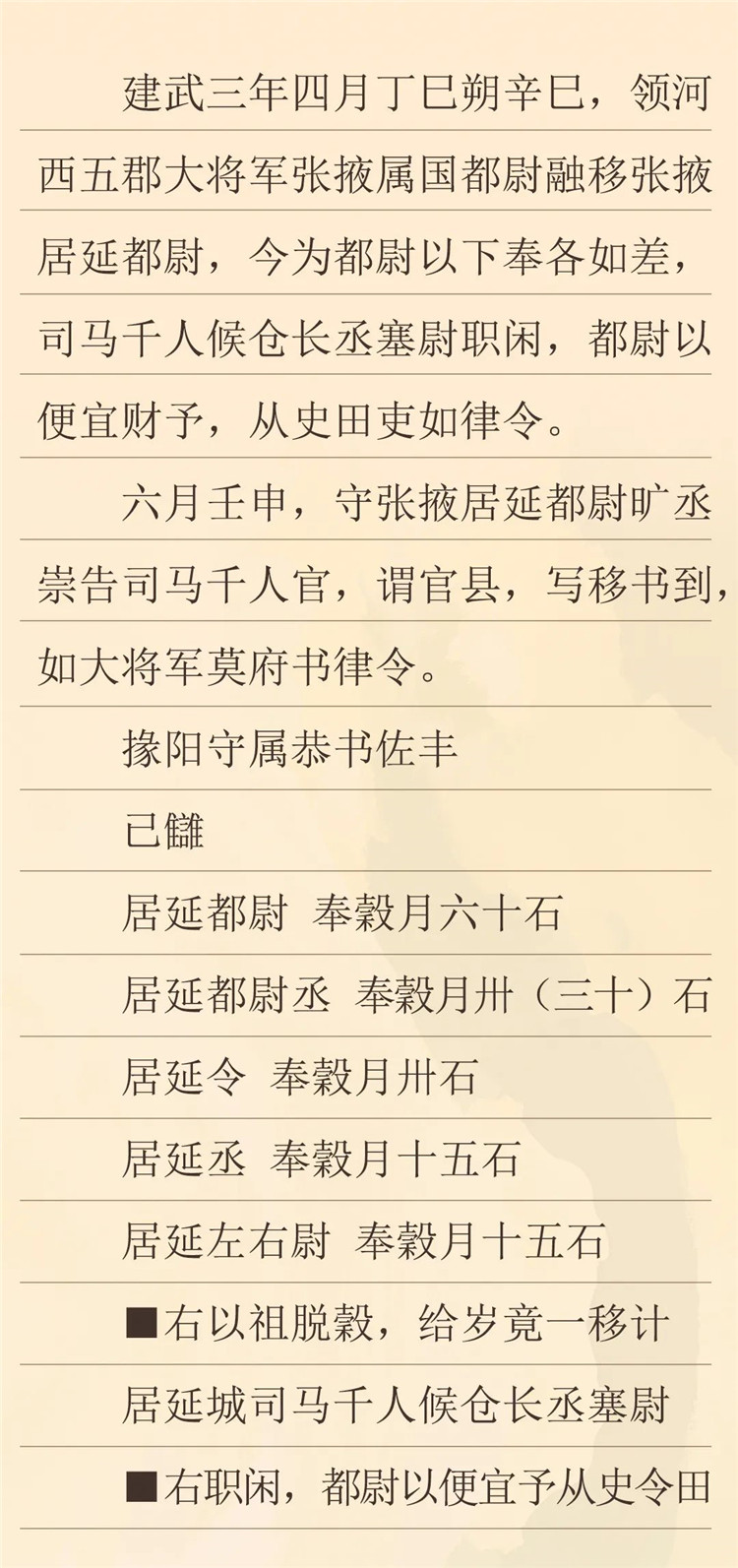 這封冊(cè)書記載了建武三年,竇融管轄河西時(shí)發(fā)布的一條關(guān)于都尉以下官吏奉谷等差的命令。根據(jù)竇融發(fā)布的新規(guī)定,我們可以看到,秩比二千石的居延都尉月奉谷僅為六十石,史書有“十斗一斛”及“十斗一石”的記載,此六十石即是六十斛,相比于史書記載中比二千石每月百斛的俸例要少,而其余官吏的俸祿也相應(yīng)要少,雖然漢代不同時(shí)期的官吏俸祿存在變化,但對(duì)比所見的這種情況,可能也跟兩漢之交戰(zhàn)亂頻仍的社會(huì)環(huán)境有重要關(guān)系。(李晶整理)