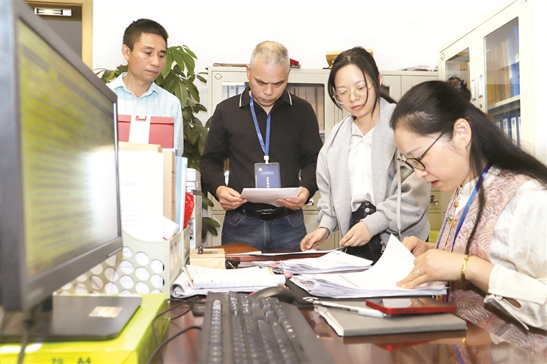 “五一”將至,浙江省金華市婺城區(qū)紀(jì)委監(jiān)委堅守節(jié)點,對重點場所、重要領(lǐng)域和關(guān)鍵環(huán)節(jié)開展監(jiān)督檢查,打好糾治“四風(fēng)”組合拳。圖為該區(qū)紀(jì)委監(jiān)委聯(lián)合審計、財政等部門對某單位“三公”經(jīng)費使用和津補貼發(fā)放情況進(jìn)行抽查。樓婷 攝