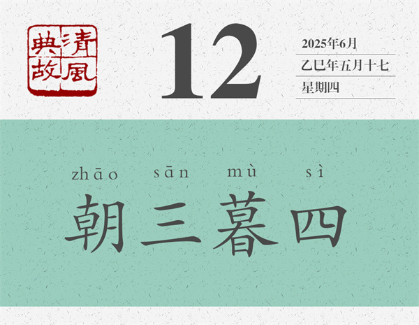 《列子·黃帝》:“宋人有狙公者,愛狙,養(yǎng)之成群,能解狙之意,狙亦得公之心。損其家口,充狙之欲。俄而匱焉,將限其食。恐眾狙之不遜于己也,先誑之曰:‘與若芧,朝三而暮四,足乎?’眾狙皆起而怒。俄而曰:‘與若芧,朝四而暮三,足乎?’眾狙皆伏而喜。”