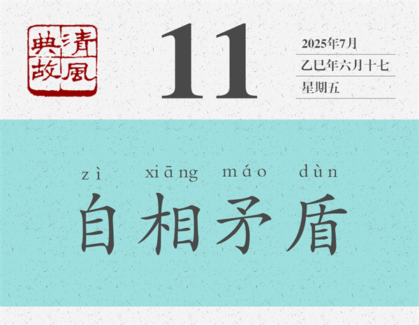 “自相矛盾”的本義是,不管是自己的矛刺穿了自己的盾,還是自己的盾無法被自己的矛刺穿,都會陷入不能自圓其說的難堪境地。后人則以“自相矛盾”為典,比喻一個人前面說的和后面說的、前面做的和后面做的相互抵觸,或者自己所說與所做、自己所為與所述互相沖突。也指同一機(jī)關(guān)、同一機(jī)構(gòu)中各個部門、各個成員之間說法不統(tǒng)一,行為不一致。宋人王觀國《學(xué)林·言行》:“圣賢言行,要當(dāng)顧踐,毋使自相矛盾。”