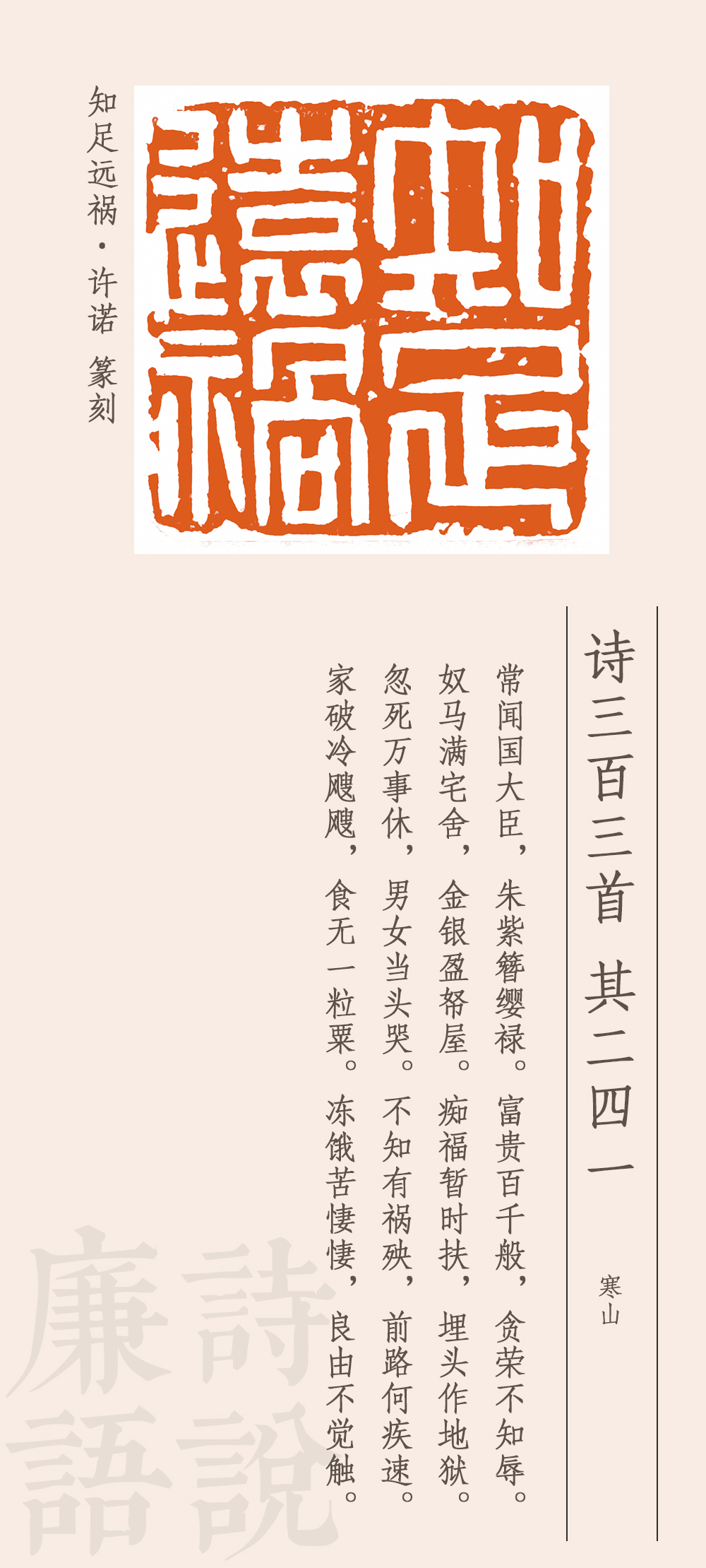 這首詩是諷刺高官貪圖富貴、聚斂財(cái)物的。他說,有些國之大臣,穿戴尊榮,好不威風(fēng),享受千般榮華富貴,卻一點(diǎn)兒都不顧及廉恥榮辱,家中擁有大量駿馬奴仆,屋子里堆滿金銀財(cái)寶,自以為這是在享福,其實(shí)是在給自己挖墳?zāi)沟鬲z。一旦死去,萬事皆休,富貴是無法永久保留的。如果因貪腐而遭受禍殃,那下場就會(huì)很慘。家破人亡,挨凍受餓,凄風(fēng)苦雨,苦不堪言。最后一句卒章顯志:之所以會(huì)有這樣的遭遇和結(jié)局,是因?yàn)闆]有悟透取禍的原因。這個(gè)原因從前面所述來看,就是太貪婪、不知足。