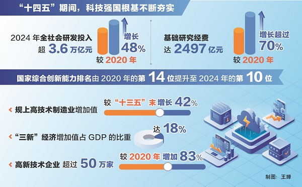 “這五年,科技創(chuàng)新能力穩(wěn)步提升,科技強(qiáng)國(guó)根基不斷夯實(shí)。”陰和俊說,我國(guó)科技投入持續(xù)增加,2024年全社會(huì)研發(fā)投入超3.6萬億元,較2020年增長(zhǎng)48%;基礎(chǔ)研究經(jīng)費(fèi)達(dá)2497億元,較2020年增長(zhǎng)超過70%,在量子科技、生命科學(xué)、物質(zhì)科學(xué)、空間科學(xué)等領(lǐng)域取得一批重大原創(chuàng)性成果;國(guó)家實(shí)驗(yàn)室體系建設(shè)穩(wěn)步推進(jìn),國(guó)家科研機(jī)構(gòu)、高水平研究型大學(xué)科研能力不斷提升,科技領(lǐng)軍企業(yè)加快培育成長(zhǎng);北京、上海、粵港澳大灣區(qū)國(guó)際科創(chuàng)中心支撐引領(lǐng)和輻射帶動(dòng)作用不斷增強(qiáng),深圳-香港-廣州躍居全球百強(qiáng)創(chuàng)新集群榜首;國(guó)家綜合創(chuàng)新能力排名由2020年的第14位提升至2024年的第10位。