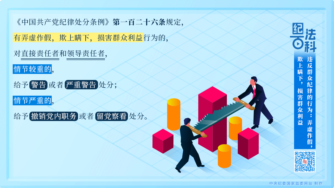 《中國共產(chǎn)黨紀律處分條例》第一百二十六條規(guī)定,有弄虛作假,欺上瞞下,損害群眾利益行為的,對直接責任者和領(lǐng)導責任者,情節(jié)較重的,給予警告或者嚴重警告處分;情節(jié)嚴重的,給予撤銷黨內(nèi)職務(wù)或者留黨察看處分。