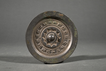 漢代,直徑9.7厘米。半圓形背鈕,鈕周飾連弧紋,外圈一周銘文,背沿寬平。銅鏡正衣冠、明是非,“昭明”即“內(nèi)清質(zhì)以昭明,光輝象夫日月”,以潔凈光明的鏡面為象征,表達了人們潔身自好的精神追求。