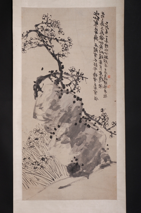 清代,水墨花鳥畫立軸,吳昌碩、王一亭合作,紙本??v128.5厘米,橫63.3厘米??钍?ldquo;乙卯春一亭種水仙搬頑石,吳昌碩補(bǔ)梅并題”;鈐“缶翁”白文方印、“一亭父”朱文方印。構(gòu)圖險(xiǎn)奇,巨石斑駁渾厚,梅樹老干椏槎(chá),鐵骨錚錚,新枝旁出,穿插于其間,凌空屈曲,花開數(shù)朵,疏落有致,石旁水仙茂盛,纖塵不染。吳昌碩、王一亭合璧之作。
