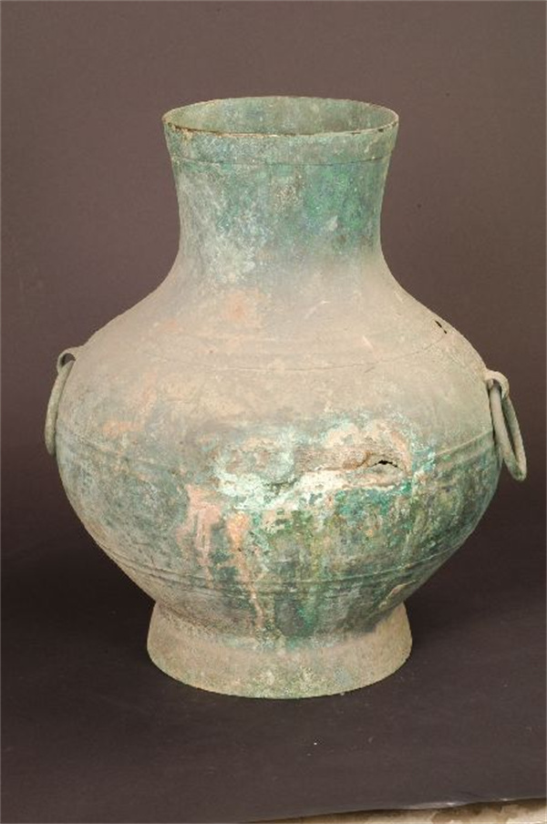 漢代,武威雷臺(tái)漢墓出土。高44.2厘米,口徑18.1厘米,底徑21.9厘米。直口,圓腹,假圈足,腹部有三組瓦紋和對(duì)稱(chēng)的兩個(gè)獸面銜環(huán)輔首,腹上部篆書(shū)“巨李鍾”三字。李,姓氏?!墩f(shuō)文•金部》:“鐘,酒器也。從金,重聲。”