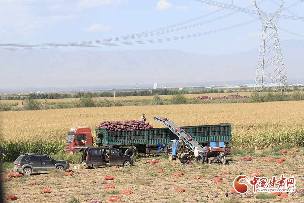 腳下有稻田,耳邊有水聲。帶著泥土的洋蔥整跺碼放,依次裝進(jìn)卡車?yán)?,鮮綠的高原夏菜在田間地頭收割后送進(jìn)發(fā)往南方的冷柜,百畝靑儲(chǔ)玉米經(jīng)過(guò)壓縮打包等待進(jìn)入牧場(chǎng)糧倉(cāng)……祁連山下秋收正在火熱進(jìn)行中。