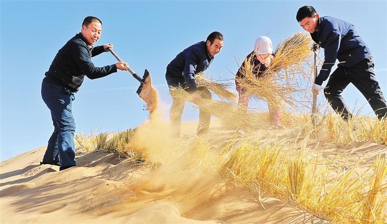 古浪縣八步沙林場(chǎng)工人在騰格里沙漠邊緣打草方格壓沙。甘肅省大力弘揚(yáng)“時(shí)代楷模”八步沙林場(chǎng)“六老漢”的奮斗精神,2012年至2021年,全省累計(jì)完成植樹造林4321.21萬畝,沙化土地綜合治理2015萬畝。張文燦攝(中經(jīng)視覺)